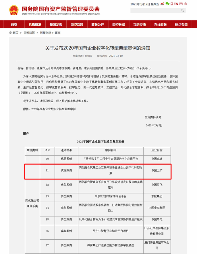 3月10日,国务院国资委发布“2020年国有企业数字化转型100个典型案例”,中国十七冶集团申报的《两化融合筑基工业互联网建设促进企业数字化转型发展》荣获“优秀案例奖”,成为中国五矿唯一入选的优秀案例。