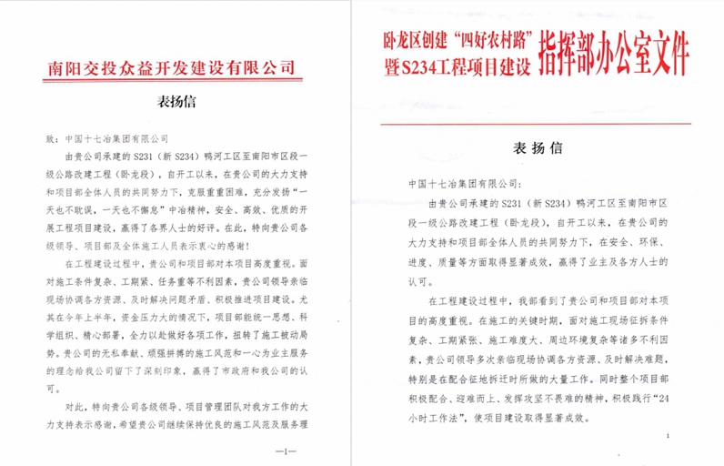 南阳卧龙S234项目建设指挥部、南阳交投众益开发建设有限公司向十七冶致表扬信